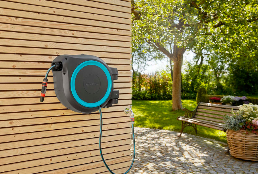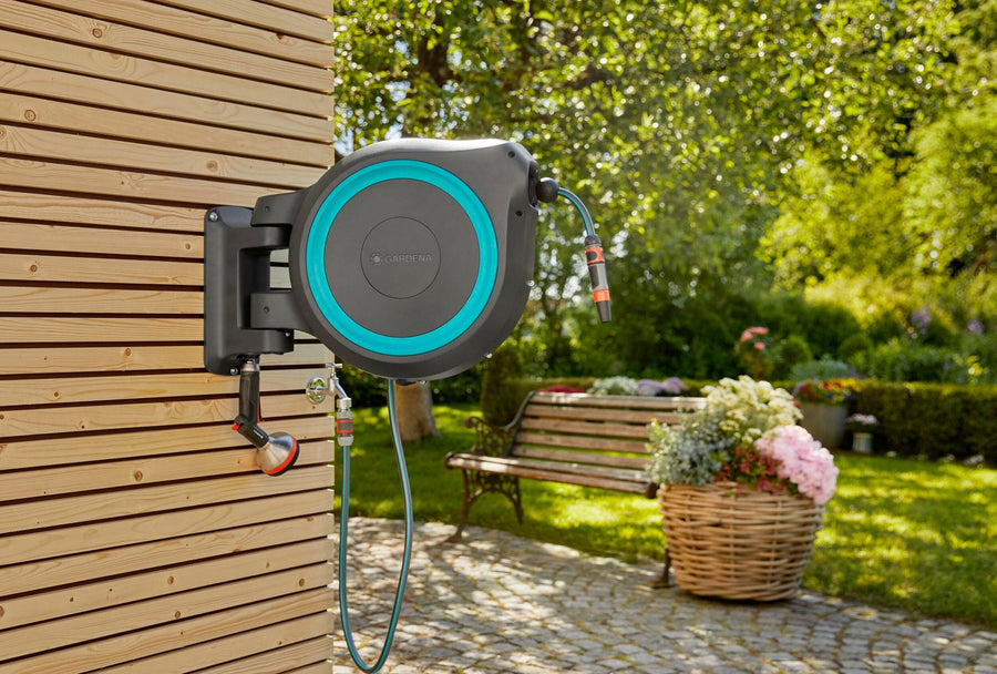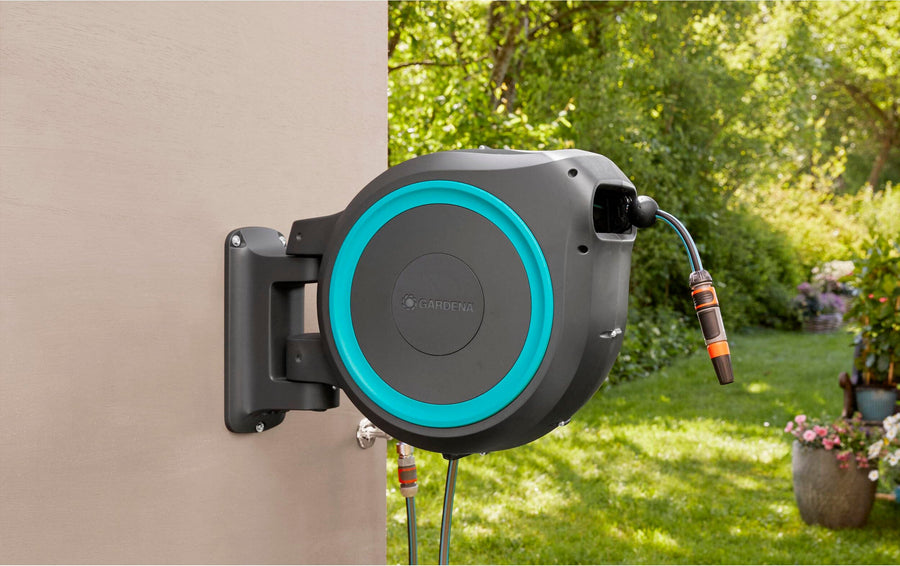 DescriptionGARDENA Premium Wall-mounted Hose Box SetThe elegant solution to keeping a yard well-watered and looking its best.It’s easier than ever to keep your yard well-watered and looking its best with the GARDENA Wall-mounted Hose Box with spring-loaded hose retraction. It’ll help keep your yard tidy by ensuring your hose is always tucked away out of sight between waterings. And it also means your hose won’t be out on the lawn where it can be tripped over when it isn’t being used.It’s simple to mount the hose box to your house and connect it to your tap. And once that’s done, you’ve got a hose box that can swivel over 180° to reach every corner of your yard.To use the hose, just pull its end and it’ll unroll smoothly. The hose automatically locks when you stop pulling to make it easy to handle. And when you’re done using the hose, a light tug releases the lock and engages a spring-loaded retraction system that’s part of our RollControl technology guides your hose back onto the storage box with no kinks or knots. Your hose will be “ready to roll” the next time you need it.Part of a GARDENA systemYou’re not just buying a Wall-mounted Hose Box and hose. You’re buying into a GARDENA system that’s good for the long run–one that can evolve as your needs change.All the components are designed in accordance with the GARDENA Quick Connect System so it’s easy to “plug and play” with other GARDENA products in the future. And your hose is manufactured to tough GARDENA specifications:1) high-density, double-spiral mesh with power grip technology to reduce kinking, knotting andtwisting,2) UV stabilization to provide longer hose life and 3) eco-friendly materials to ensure the hose is free from toxins, phthalates and heavy metals.Here’s what you getWall-mounted Hose Box (that swivels over 180°)with RollControl technologyWall bracket (with template)Easy-install instructions (with links to an installationvideo)100 feet of premium-quality, eco-friendly hose(GARDENA Quick Connect System)Adjustable spray nozzle (GARDENA Quick ConnectSystem)