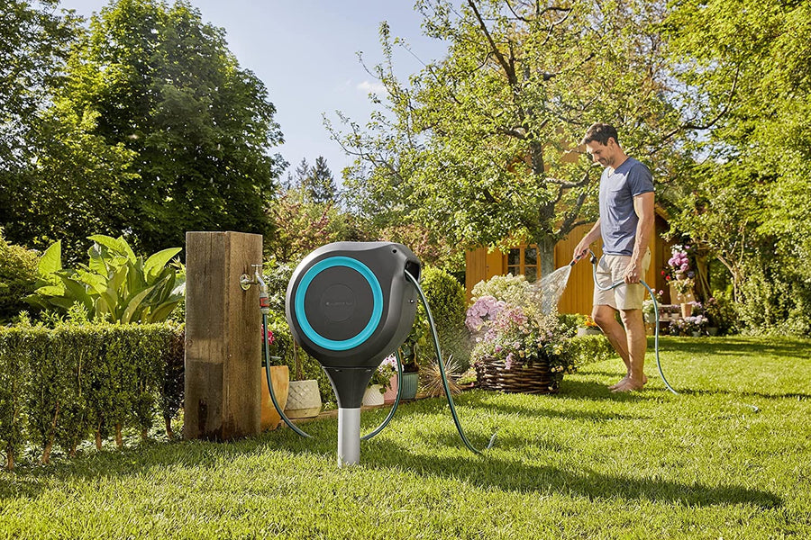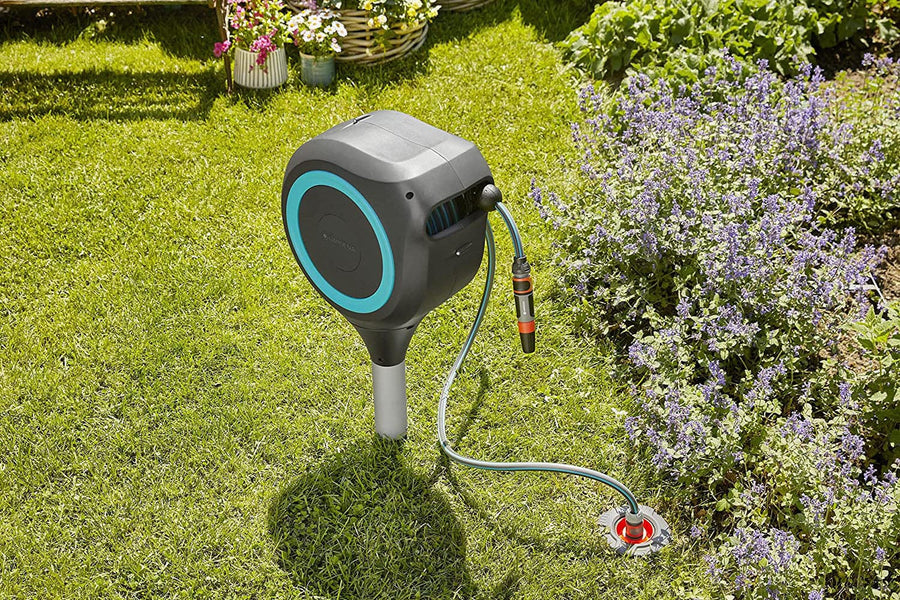 DescriptionThe Garden Hose Box RollUp for maximum freedom of movement when watering your medium-sized gardenThe Garden Hose Box RollUp M from GARDENA not only ensures safe and space-saving storage of your garden hose, but you will be thrilled how effortless watering your medium-sized garden can be. The practical Garden Hose Box is anchored in the ground using sturdy stand at a location of your choice in a flowerbed or on the lawn. With the help of a mounting rod you can screw the metal spike into the ground even easier. For use, simply pull out the 66-foot-long water hose to the desired length and you can start watering immediately. Thanks to the built-in short locking points, handling the garden hose has never been so simple: as soon as you stop with the hose, the locking device automatically engages at the desired extension length. The innovative design can be swivelled through 360°, ensuring maximum flexibility for garden irrigation. The box always follows your movements, so you can easily reach every corner of your garden without the garden hose kinking or tangling. In addition, this hose box saves you from tiresome cranking, rolling up and dirty hands: A short pull on the end of the hose releases the lock and an integrated steel spring rolls the garden hose back in fully automatically and reliably. The box has a practical hose guide that keeps the hose on track so that no blockages or knots occur. The innovative RollControl technology ensures safe, controlled and effortless retraction with zero tangles. The high quality material is protected by both UV and frost protection and offers a long service life and usability without maintenance. The box is particularly compact and stylishly designed so that it can be easily integrated into any garden. In addition, it is adjusted to the height of the GARDENA Mowing Robots so that the lawn around the Hose Box is always maintained and mowed. Included with the Garden Hose Box is a flexible connecting hose, all necessary assembly parts and Original GARDENA System elements as well as a sprayer with two different spray patterns.